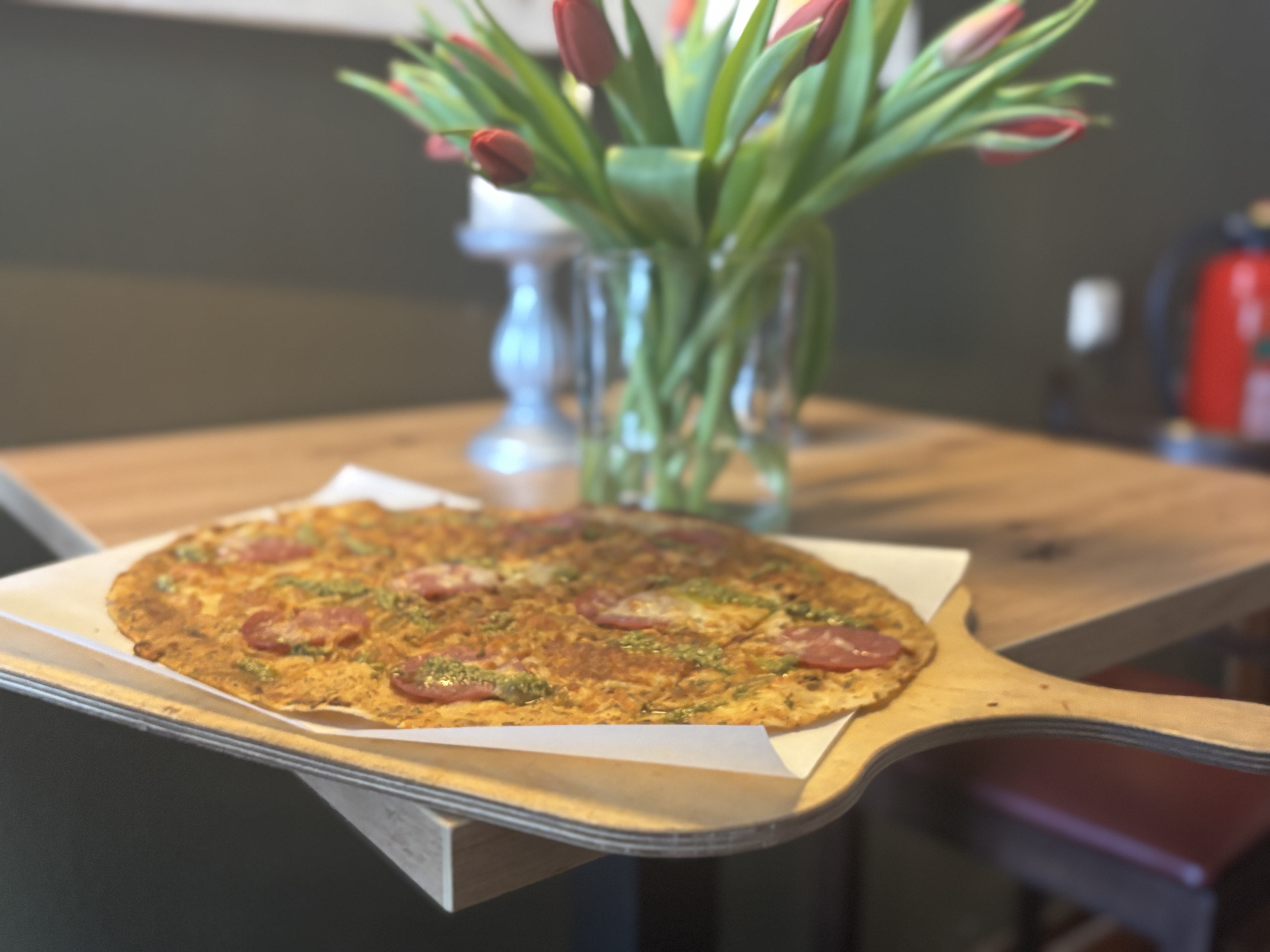 Knuspriger Flammkuchenboden mit tomatisierter Crème, würziger Salami und zart schmelzendem Mozzarella.